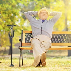 Bastón con función única y dos empuñaduras pivotantes para máximo soporte y apoyo en posición sentada y de pie. Se pliega de forma compacta para viajes en coche, autobús y avión.